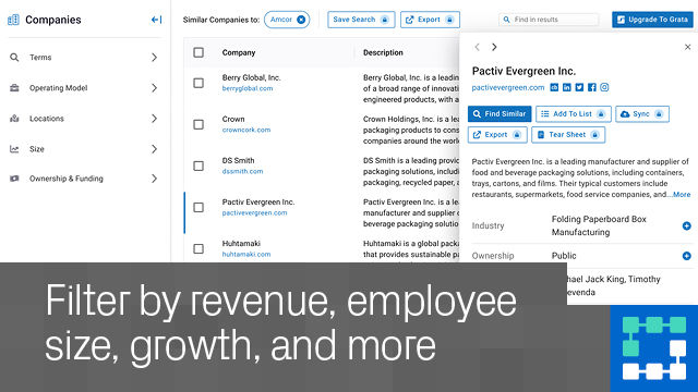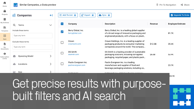 What data powers Similar Companies, a Grata preview? The AI search tool draws on Grata’s proprietary platform of 19 million+ private and public companies, to deliver investment-grade company data.